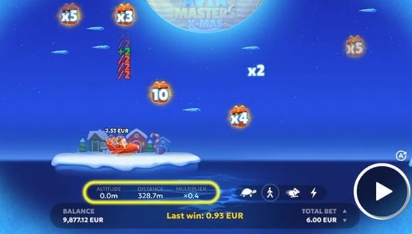 Las animaciones celebran la temática: los bloques de hielo sustituyen a los cohetes y las cajas de regalos representan a los multiplicadores. Además, cuando se producen grandes victorias, aparecen mensajes divertidos como “Big Win”, “Mega Win” o “Super Mega Win”, reforzando aún más la atmósfera festiva y alegre.